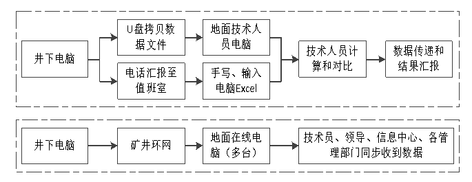 某矿自定向钻机使用定向钻机以来,定向钻进轨迹数据、钻机运转情况、当班施工情况一直使用U盘存储器拷贝、手工誊写、电话汇报、升井后地面手工记录等落后方式进行井上、井下数据交互和工作汇报。这些操作对数据查阅均具有滞后性,延滞时间在一个班至数天不等,无法及时的根据现场打钻情况进行轨迹控制的管理和指导,井下施工严重依赖现场钻机机长的施工经验,不利于及时发现和预判钻孔施工中存在的问题。